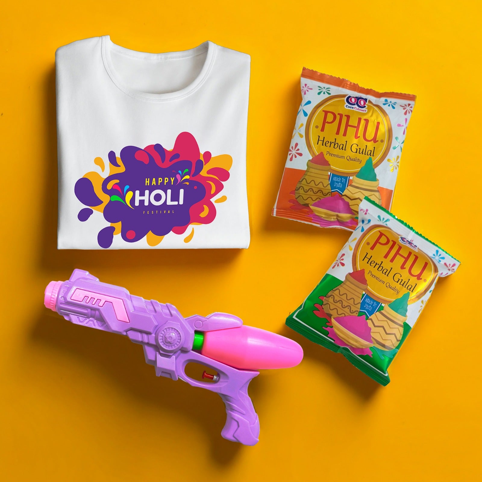 Get ready to celebrate Holi in the most colorful and exciting way with our Holi Celebration Combo Kit! This all-in-one set includes a high-quality pichkari, herbal gulal, and a premium unisex Holi T-shirt—making it the perfect combo for a memorable festival.