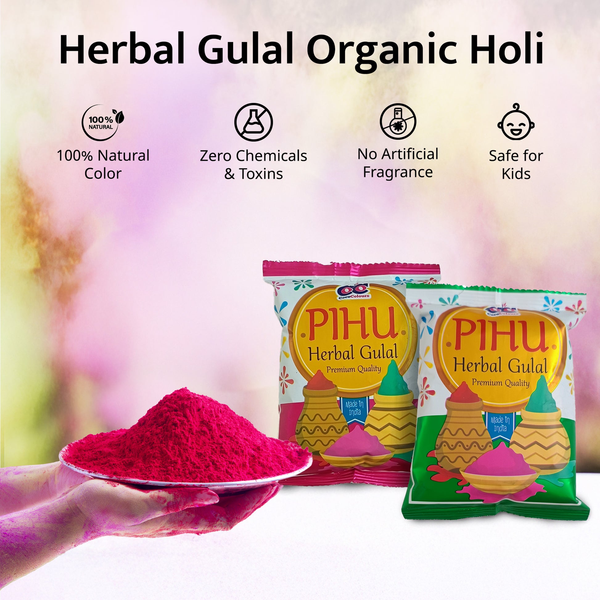 - Safe & Eco-Friendly: Our herbal gulal is made from natural ingredients and is skin-safe.